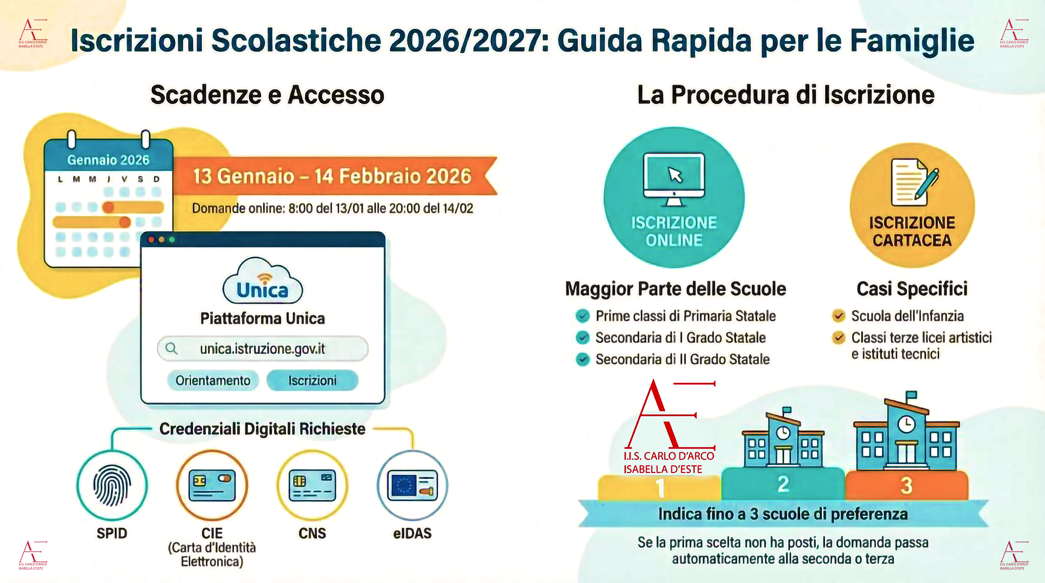 Le domande di iscrizione online devono essere inoltrate dalle ore 8:00 del giorno 13 gennaio 2026 alle ore 20:00 del 14 febbraio 2026 utilizzando le credenziali SPID (Sistema Pubblico di Identità Digitale), CIE (Carta di identità elettronica), CNS (Carta Nazionale dei Servizi) o eIDAS (electronic IDentification Authentication and Signature).